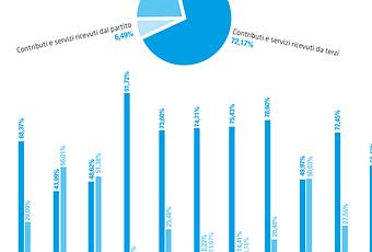 Sul totale di tutte le entrate i contributi e i servizi da parte di terzi pesano per il 72%. Un altro 21% è costituito da fondi erogati dai candidati, e solo il 6,49% proviene dal partito, in forma di contributi o di servizi. La Lega è il gruppo con la maggiore percentuale di entrate da terzi (91,72%) e la minore quota di erogazioni dei candidati (8,28%).