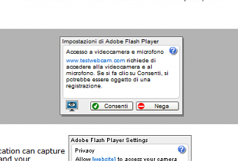Una volta concesso l’accesso del sito alla webcam cliccando su consenti nella richiesta di Adobe Flash Player (quella in alto nel rettangolo grigio) compariranno due riproduttori video, in quello di sinistra viene riprodotta la webcam normale come la useremmo per chattare, in quello di destra le immagini catturate dal dispositivo vengono usate come sensore di movimento nel caso usassimo la webcam come antifurto.