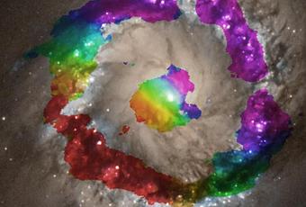 Nell’immagine vedete la regione centrale di NGC 1097 osservata con ALMA (ESO) This is the central region of NGC 1097 observed with ALMA. La velocità dell’acido cianidrico (HCN gas) è mostrata con questi colori e sovrapposta all’immagine ottica presa dal telescopio orbitante Hubble: il rosso indica il gas che si sta allontanando da noi, mentre il viola indica il gas che si avvicina. Crediti: ALMA (ESO/NAOJ/NRAO), K. Onishi (SOKENDAI), NASA/ESA Hubble Space Telescope