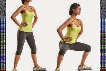 Esercizio 4: partire dalla posizione eretta, aprire le gambe con le punte dei piedi rivolte all'esterno. Tenere il busto fermo e stringerei glutei, scendere fino a che il bacino non raggiunge la linea delle cosce. Rimanere così per 1 minuto e poi risalire, potete arrivare a 2 minuti via via che aumentate la vostraresistenza. Fare 2 serie da 10 piegamenti.