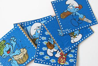 Abbiamo tagliato tutte le immagini dei puffi e ricavato altrettanti rettangoli dal cartone del monopattino che hanno regalato i nonni.