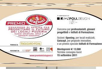 Il “Premio Le 5 Stagioni” è un nuovo concorso rivolto a professionisti, architetti, designer, progettisti di aziende contract e proprietari di locali pizzeria, italiani e stranieri. Ha come tema la progettazione di locali dedicati alla preparazione e al consumo di pizza, pensati come spazi innovativi che devono esprimere la qualità del prodotto, del servizio e dell’ambiente, oltre che i valori di comunicazione e l’interazione con i clienti. E’ promosso dalla linea di farine specializzate “Le 5 Stagioni” di Agugiaro & Figna Molini in collaborazione con POLI.design - Consorzio del Politecnico di Milano e prevede due sezioni: “Opening”, per locali già realizzati e “Concept”, per proposte progettuali e concept di locali pizzeria. E’ previsto un premio speciale per gli Istituti di Formazione. Il concorso ha il patrocinio di ADI (Ass. per il Disegno Industriale), AIPi (Ass. Italiana Progettisti in Architettura d’interni) e AIAP (Ass. per la Progettazione Visiva). Il termine ultimo per la presentazione dei lavori è il 15 settembre 2011. Il montepremi complessivo è di Euro 13.500.