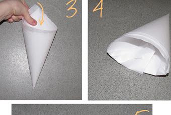 Prandere un quadrato di carta da forno (30x30 cm circa)Piegare a metà lungo la diagonale - Foto 1Prendere i due angoli, arrotolarli verso l'interno e verso il centro, portando le punte in alto fino a formare un cono - Foto 2Piegare Le punte verso l'interno del cono per "fermarlo" - Foto 3Riempire con la crema o il cioccolato e chiudere bene a pacchettino - Foto 4Tagliare una piccola punta nella parte inferiore per far uscire la crema o il cioccolato - Foto 5
