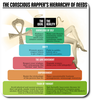 Il post consisterebbe solo nel guardare l'immagine qua sopra, tuttavia, visto che non tutti hanno idea di cosa sia un rapper "conscious", ho deciso di dilungarmi un po' su questo concetto. Il termine"rapperconscious"è molto generalista, poichè va ad etichettare tutti queirappersche non glorificano le armi, non sono dediti allo spaccio della droga e soprattutto hanno un po' più di rispetto verso la propria controparte femminile. Un "rapper conscious" mette al centro delle sue canzoniquestioni sociali, positività,e responsabilizzazione.Il problema è chei fan di questi personaggi spesso pongono i loro beniamini su dei piedistalli, per il sol fatto di rappresentare, almeno musicalmente, un esempio di moralità e di integrità.Ecco perchéla gentesembra rimane sempre scioccataquando tali rapper rompono le righe degli stereotipi che li descrivono. Un esempio di ciò può essere JayElectronica, cherecentemente ha parlatosulpalcodi unascommessa di $20.000dollariche avevafatto conNascirca il piacere sessuale delle donne nell'essere soffocate durante "l'atto". Beh, sinceramente, ogni rapper può parlare di ciò che gli pare purchè la sua musica sia in grado di coinvolgere emotivamente il pubblico!!!