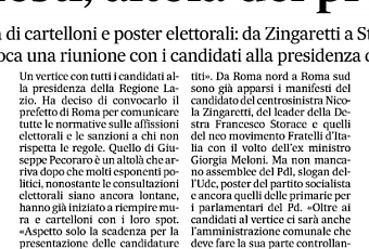 Che la città è già massacrata da manifesti e cartelloni elettorali non gli è certo sfuggito. Lo vede tutti i giorni con i suoi occhi. E probabilmente glielo ricordano continuamente i numerosi comitati cittadiniche lottano contro l’invasione delle affissioni soprattutto quelle dei partiti politici. Così il prefetto di Roma, Giuseppe Pecoraro, ha preso le contromisure. Almeno quelle di sua competenza: "Subito un vertice con tutti i candidati alle elezioni regionali - annuncia - per il rispetto della normativa e la comunicazione di tutte le regole e le sanzioni".