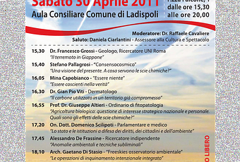 L'associazione "conosci" e l'associazione culturale "in cammino", con il Patrocinio dell'Assessorato alla Cultura e Spettacolo del Comune di Ladispoli, organizzano per Sabato 30 aprile un convegno sulle scie chimiche nell'aula consiliare del comune di Ladispoli, in Piazza Falcone 1, dalle 15.30 alle 20.00.