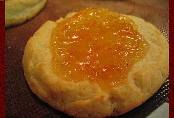 Cominciate a prendere pezzetti della vostra pasta e appiattirli con le mani e stenderli sulla teglia, se avete stampini o piú fantasia potete farli di diverse forme ma i classici cookies sono tondi. Premete con il pollice al centro e fate come una conca in cui metterete un cucchiaino di marmellata.