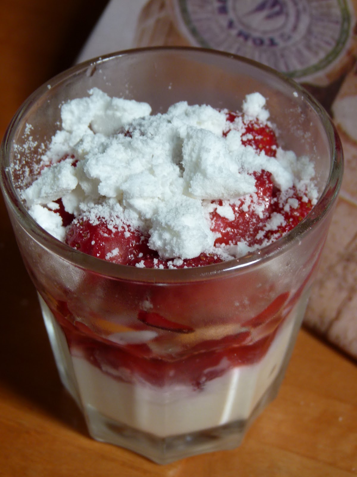 Per il sessantesimo compleanno di mio papà abbiamo deciso di organizzare una festa a sorpresa a casa ed invitare una trentina di amici, preparando noi una sorta di buffet.Il dolce doveva essere qualcosa di abbondante (insomma, trenta fette non sono poche) e scenografico, essendo una torta di compleanno...ed è così che mi sono cimentata in una specie di meringata casalinga! Spero di rifarla a breve, almeno nella versione autunnale (con crema di marroni, marrons glacés e cioccolato fondente), in modo da mostrarvi le foto! Ma per paura che venisse una schifezza io e mia sorella abbiamo pensato bene di preparare altri piccoli dolcetti: mousse al cioccolato fondente, Grand Marnier e scorzette candite, mousse di fragola, banana e yogurt (praticamente il gelato dell'altra ricetta, ma senza panna e tenuto solo in frigo), tartellette con crema alla ricotta e cioccolato e con pasticciera e frutti di bosco.L'avanzo di meringa e l'avanzo di crema alla ricotta alla fine hanno trovato nuova vita nella coppetta qui sopra!In pratica ho utilizzato la crema già vista per le tartellette, va bene anche quella del giorno prima, mettendone uno strato come base, in questo caso in un bicchiere di vetro. Per lo strato successivo aggiungere fragole tagliate a pezzetti o se preferite fatte insaporire qualche ora con un poco di zucchero e liquore, magari rum, scolandole bene prima di metterle nel bicchiere. Completare con meringa sbriciolata e servire subito.Questo per evitare, nell'ordine: che le fragole rilascino troppa acqua, che la crema si scaldi, che se tenuta in frigo la meringa diventi molle...Partendo dallo stesso concetto, si può creare una coppetta analoga utilizzando come base una panna cotta non riuscita (tipo i miei primi tentativi alle prese con l'agar-agar), del semplice gelato al fiordilatte oppure, come già visto, dello yogurt greco.Ma vi avevo già detto come fare lo yogurt greco "in casa"?