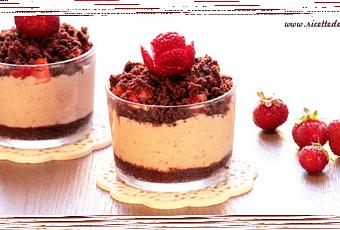 Un dolce estivo in coppa preparato con crema di fragole, biscotti al cioccolato e fragole intere. Una vera delizia.