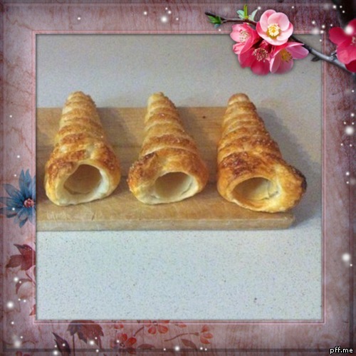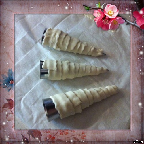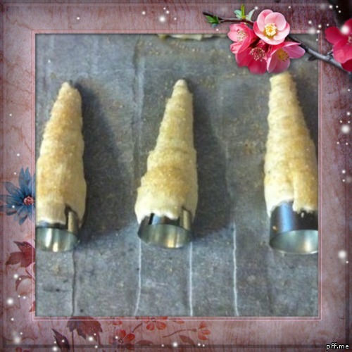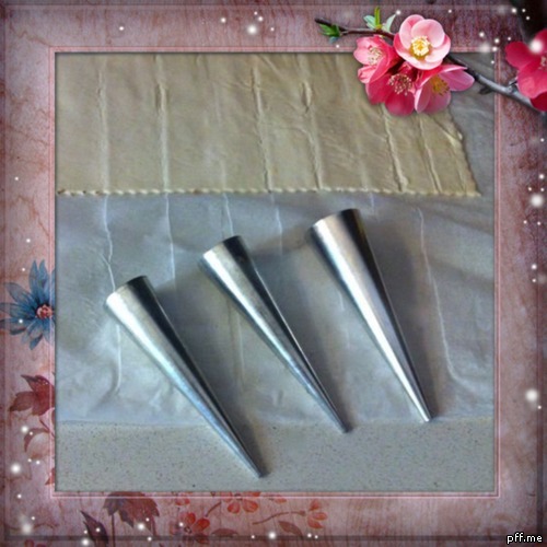 Arrotolate ogni striscia di pasta sfoglia su un cono a cominciare dalla parte bassa del cono quella a punta e ricordate di sovrapporre leggermente la pasta sfoglia in maniera tale che non si apra in cottura.