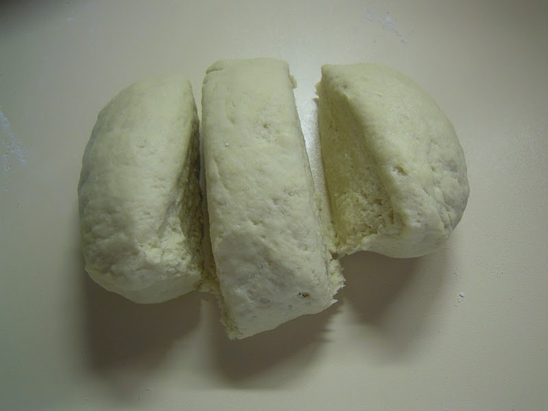 Impastare tutti gli ingredienti insieme, fare un panetto e lasciarlo riposare una mezz'ora a temperatura ambiente. Trascorso questo tempo dividere il panetto in tre parti uguali, e formare tre palline.