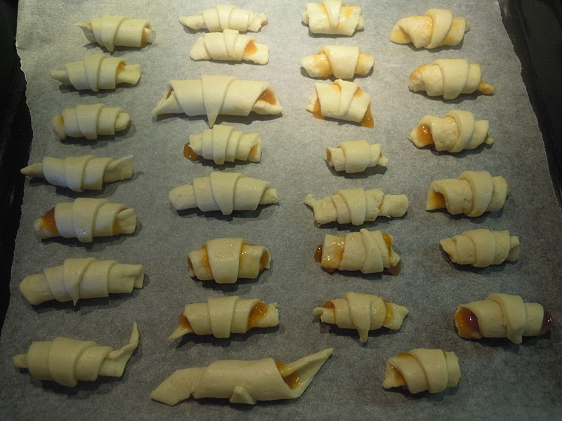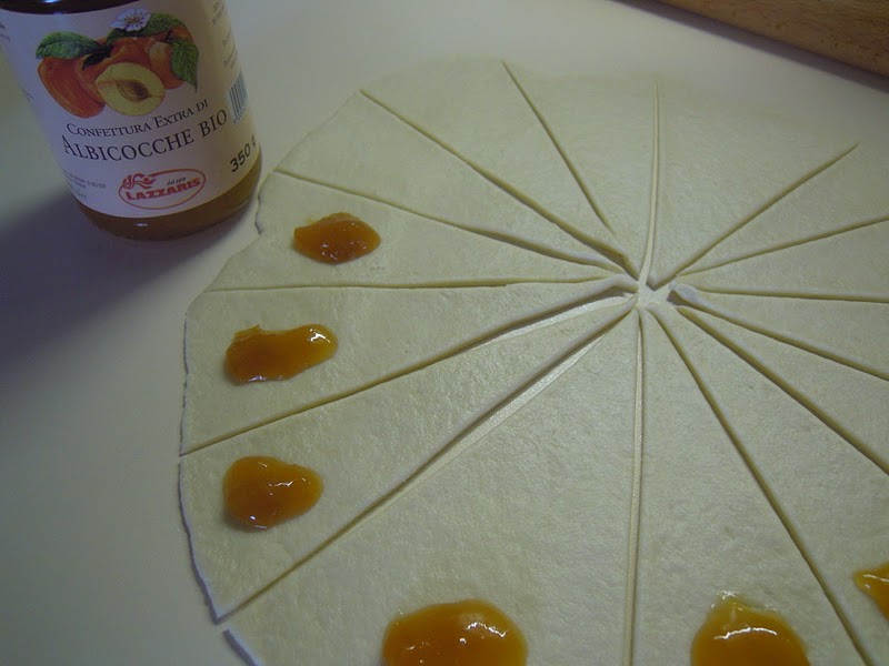 Prendere una pallina di pasta, stenderla con il matterello a forma di cerchio e dividerla in 16 parti, se vi piacciono più grandi potete dividere l'impasto in otto anzichè in 16 parti, ma piccolini sono più sfiziosi. Mettere un po' di confettura e formare i cornetti. Fare lo stesso con la rimanente pasta.