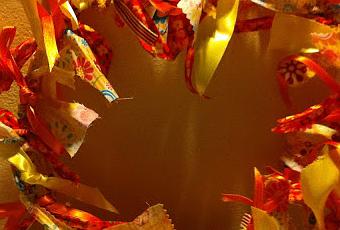 Oggi sono felice di condividere con voi una corona fai da te molto semplice che si può fare con gli scarti di tessuto, nastro e fil di ferro.