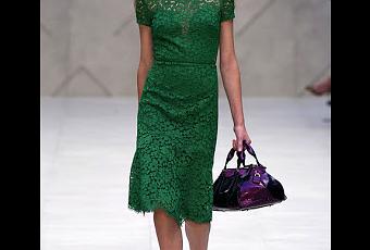 Burberry fa centro al primo colpo: verde, il colore dell'anno, pizzo, che ci piace tanto tanto perchè fa bon ton, associato poi alla lunghezza sotto al ginocchio... e nemmeno troppo trasparente!Abbinato a scarpe blu elettrico e alla borsa viola.Perfetto, un bel 9.