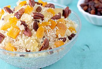 Questa ricetta è una versione di cous cous dolce, una vera leccornia, molto semplice da preparare e soprattutto fresca. Per l'occasione ho preparato una versione con frutta secca, perfetta da portare ad un pic-nic, ad una gita fuori porta oppure, perchè no, anche in spiaggia. Un tocco esotico dovuto al mango e all'ananas secchi e una nota croccante a base di noci Pecan, dal retrogusto intenso per contrastare con la dolcezza delle albicocche.Per sorprendere i vostri ospiti alla fine di una cena estiva aggiungete un pizzico di cannella profumata e per renderla ancora più irresistibile provatela con il gelato o con tanti golosi pezzi di cioccolato.Queste le quantità per 2-3 persone.