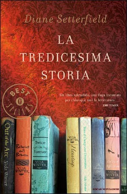 Come prima cover ho scelto "La tredicesima storia" di Diane Setterfield. Una parete rossa damascata sullo sfondo e in primo piano una serie di libri dall'aspetto antico, un po' consumato, in cui spicca uno spazio vuoto. Quale libro mai mancherà in questa serie?