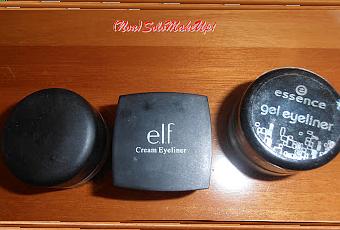 Gel Eyeliner Essence:Prodotto totalmente opposto al precedente: consistenza cremosa, molto cremosa. Devo dire che all'inizio mi ha dato qualche problema questa sua caratteristica (si rischiava di prelevare troppo prodotto e fare dei pasticci immensi!) ma poi ci ho preso la mano e sono riuscita a dosare bene la quantità necessaria. La stesura è piuttosto semplice e il prodotto scivola bene sulla palpebra, si ha un tratto preciso e intenso immediatamente (il colore è leggermente brillante). La tenuta buona, anche se prediligo l'Elf per questa caratteristica rispetto a questo. Anche questo lo possiedo da quasi un anno, e si è leggermente seccato ma è ancora utilizzabile. Ottimo rapporto qualità/prezzo.