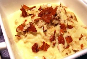 Pestate con un pestello (o come desiderate) le mandorle.Quando la crema sarà pronta servitela in uno scodellino e unitevi la granella appena ottenuta.