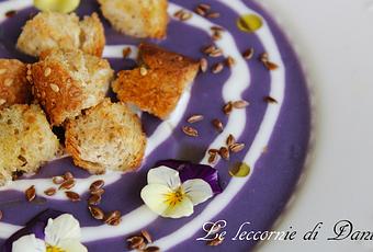 INGREDIENTIPatate violabrodo vegetale (con carote, cipolla, sedano)cipolla scalognayogurt grecoviolesemi di linopane ai cereali