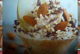al momento di servire guarnire con qualche fettina di pera mandorle e il cioccolato grattugiato grossolanamente ed ecco il nostro dolce in tutta la sua bellezza