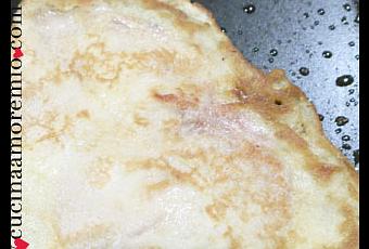 Con un pennello da cucina ho unto una padella antiaderente (circa 25cm di diametro) con olio, messa su fuoco medio/alto e quando la padella era diventata calda ho versato un terzo del composto inclinando subito in tutte le direzioni in modo che la pastella coprisse tutto il fondo della padella (ecco perché il composto deve essere abbastanza liquido, altrimenti anche con l’effetto del calore, non si distribuirà ed invece di una crepe otterrete un pancake - frittelle americane molto spesse di circa 10 cm di diametro).