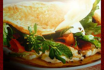 spalmate ciascuna con lo stracchino e coprite con le fette di prosciutto e le erbe selvatiche