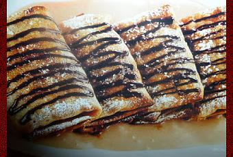 fate intiepidire la crema di marroni con la panna 25 g di acqua e un goccio di Gran Marnier distribuite la crema nei piatti e servite con le crespelle decorando con crema alla nocciola
