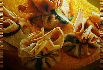 distribuite il ripieno sulle crespelle e chiudetele legandole con il nastro del porro scuocete in forno per 10' a 180°