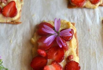 Accendere il forno a 180° C. Mettere la pasta sfoglia su una teglia da forno foderata da carta forno, ritagliare dei rettangoli regolari e bucherellarla con una forchetta, coprirla con un foglio di carta di alluminio, metterci sopra una teglia pesante e cuocere per 20 minuti circa, fin quando la pasta sfoglia non sarà dorata. Estrarre dal forno, spolverizzare con zucchero a velo e infornare di nuovo per 5 minuti per far caramellare lo zucchero, quindi estrarre dal forno e lasciare freddare. Preparare la crema pasticcera mescolando con il mixer lo zucchero con i tuorli e l'amido di mais fino ad ottenere un composto omogeneo. In una casseruola portare ad ebollizione il latte, metà panna e la vaniglia in polvere (o 1 bacca di vaniglia), togliere la casseruola dal fuoco continuare a mescolare e incorporare un terzo dei tuorli. Quindi aggiungere i restanti due terzi del composto di uova mescolando continuamente. Rimettere la casseruola sul fuoco (se avete messo la bacca di vaniglia eliminatela) e cuocere sbattendo velocemente fin quando il composto si sarà addensato. Setacciare il tutto, coprire con pellicola a contatto per evitare che si secchi in superficie e raffreddare possibilmente velocemente per evitare la proliferazione batterica. Stendere la crema pasticcera ormai raffreddata sulle fette di pasta sfoglia e aggiungere le fragole lavate e tagliate a fettine e le fragoline di bosco. (ricetta adattata dalla rivista Jamie magazine)