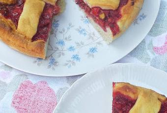 Per prima cosa tagliate a tocchettini le fragole, e mettetele in una ciotola insieme alle ciliegie, a macerare con un goccio di succo di limone e lo zucchero. In questo modo perderanno un po' della loro acqua.Impastate velocemente gli ingredienti per la base, aggiungendo acqua poco alla volta, sino ad ottenere un impasto elastico e omogeneo.Stendetene 2/3 in una tortiera (meglio se di quelle con cerniera apribile), e bucherellate per bene, anche i bordi. Ora prendete la vostra ciotola con la frutta, scolatela dallo sciroppo che si sarà formato (potete sempre riutilizzarlo per altre preparazioni dolci, frullati, gelati...vedete voi, gettarlo è un peccato). Unite la fecola, i pistacchi e le mandorle tritati e mescolate bene. Versate il composto sopra la base di frolla, terminate decorando con strisce dell'impasto.Cuocete la torta in forno caldo, a 180°C, per 35-40 minuti (controllate che non si bruci eh?!).Lasciate raffreddare completamente prima di servirla.