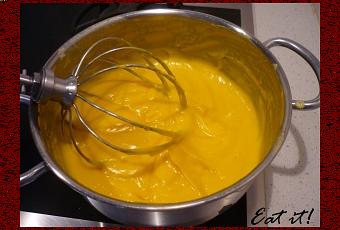 Nel frattempo facciamo la crema pasticcera. Far bollire il latte con la vaniglia. Montare i tuorli con lo zucchero, la farina e la maizena aggiunta a pioggia, quando il latte bolle, abbasso al minimo il fuoco, mischio al latte anche i tuorli con zucchero e farina e le pesche frullate e rimetto il tutto sul fuoco (fuoco medio). Continuo a girare finchè la crema non si addensa. Tolgo dal fuoco la crema e continuo a girare per circa 3 minuti.
