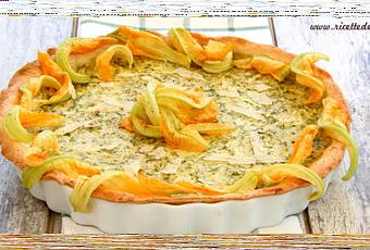 Sfornate la crostata di zucchine, decoratela con i fiori di zucca, pepe nero e scaglie di pecorino di fossa.