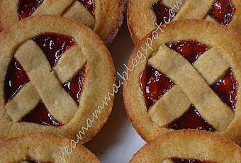 Ho imburrato le tegliette delle crostatine e con le stesse, pigiandole sulla pasta frolla come degli stampini, ho ricavato la base delle crostatine. Ho messo su di ognuna un cucchiaino abbondante di marmellata, spalmandola bene, e con delle strisce di pasta ho fatto sopra una griglia molto semplice.