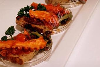 Ultimamente ho postato svariate ricette a base di polpo, dagli antipasti ai primi, essendo un alimento molto versatile e che si presta alle più svariate preparazioni.Oggi vi propongo un antipasto di pesce, il polpo affogato al pomodoro leggermente piccante su scarola scottata con olive e capperi tutto servito a condire un crostone di pane bruscato.Ingredienti