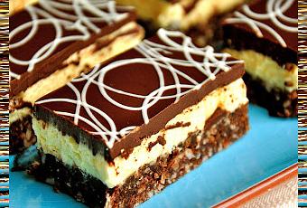 strato superiore della farcitura far sciogliere il cioccolato fondente con il burro e coprire la farcitura e mettere in frigo ad addensare sovrapporre la farcitura allo strato inferiore mettere in frigo a rassodare il tutto e portare a temperatura ambiente e tagliare le barrette ed ecco pronte le nostre barras de Nanaimo