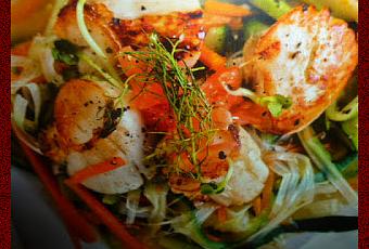 servite le capesante con le verdure irrorate del fondo di cottura e decorate con germogli e foglioline di aneto