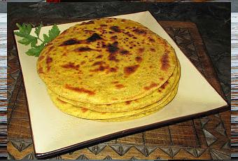 unite le due farine il sale le spezie e le foglie di coriandolo in una grossa terrina aggiungetevi poi il burro e il ghi aggiungete gradualmente anche l'acqua tiepida mentre mescolate e lavorate fino ad ottenere un impasto liscio ed elastico coprite l'impasto con una stoffa umida e lasciate riposare