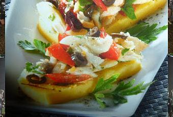 mettere i crostini di polenta su un piatto da portata condire con insalata di merluzzo guarnire con prezzemolo