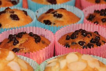 A questo punto ho separato il composto in tre parti. La prima l'ho versata nei pirottini non superando per ognuno la metà e aggiungendo in superficie scaglie di mandorle. Alla seconda parte ho aggiunto delle gocce di cioccolato amalgamate al composto e una volta versata nei pirottini, ho ricoperto con ulteriori gocce di cioccolate. Stesso procedimento con dell'uvetta lasciata prima per qualche minuto in un po' d'acqua.
