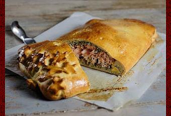 stendete la pasta brioche mettete sopra uno strato di kashè (o di semolino) cotto in acqua spolverizzate con la vesika mettete due uova sode tritate metà dei funghi tritati e i tranci di salmone bollito le altre due uova sode tritate e il resto dei funghi tritati formate un filoncino e cuocetelo in forno a 180° per 45'