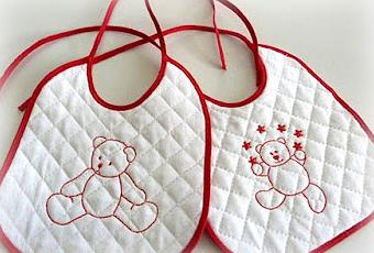 Realizzate con avanzi di piqué trapuntato, bordate con del comune sbieco rosso e ricamate a macchina. Lo spesso ricamo può essere fatto anche a mano a punto erba con del perlè da ricamo non ritorto.Se vi piacciono i miei orsetti potete chiedermi il disegno.