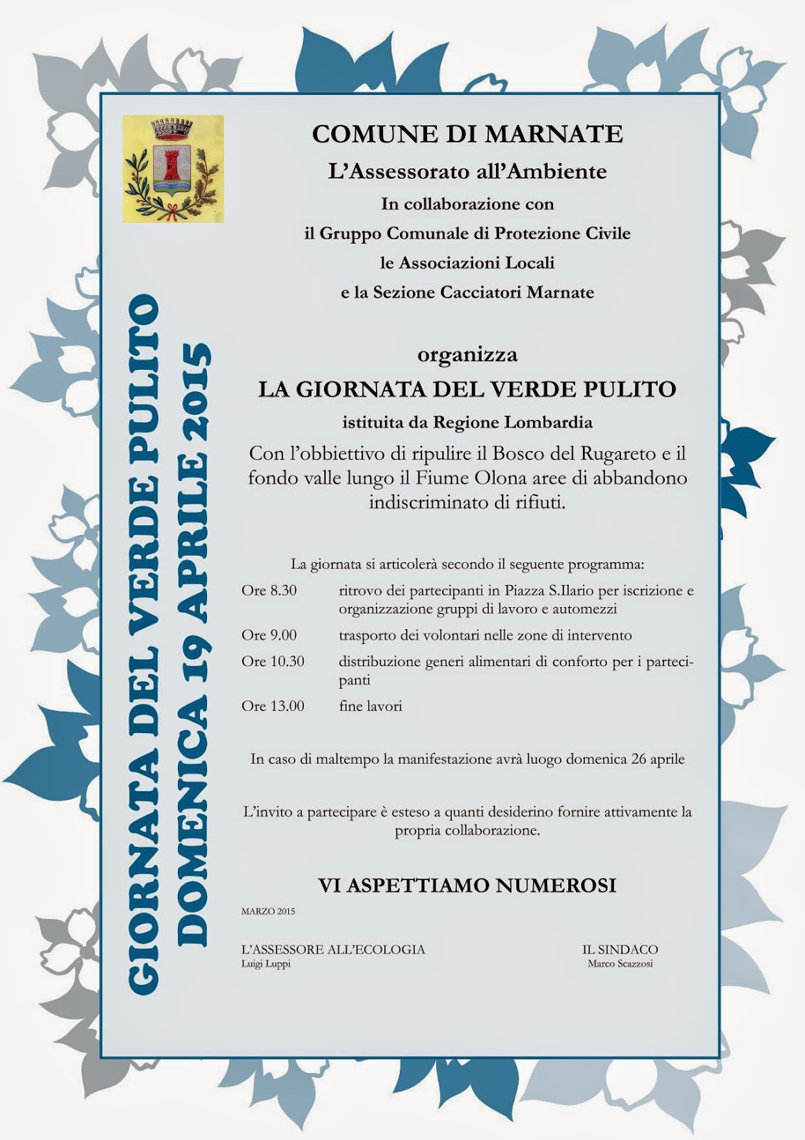 l'Assessorato all'Ambiente in collaborazione con il Gruppo Comunali di Protezione Civile, le Associazioni Locali e la Sezione Cacciatori organizza per domenica 19 aprile 2015, la GIORNATA DEL VERDE PULITO, istituita dalla Regione Lombardia, con l'obbiettivo di ripulire il bosco del Rugareto ed il fondo della valle lungo il Fiume Olona, area di abbandono indiscriminato di rifiuti.