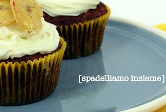 Io ho decorato mettendo la crema poi in una sac a pòche con bocchetta a stella, potete anche usare un cucchiaino semplicemente appoggiate il frosting sul cupcake a vostro piacere e decorate con quello che volete, in questo caso io ho usato fette di banana che ho passato nel forno caldo per qualche minuto, ricoperte di zucchero di canna in modo che le caramellasse.