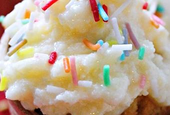 Per decorare i dolcetti “finti cono gelato”, inserite la glassa al limone in una sacca da pasticcere e distribuitene un po’ su ogni cupcakes, terminate decorando la glassa con codette di zucchero colorate.