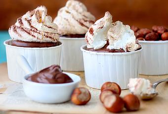 Nel frattempo preparate il frosting alla meringa. Pesate gli albumi e regolate di conseguenza anche la dose degli zuccheri. E' molto importante essere precisi in questa fase. Se, per esempio, gli albumi pesassero 32 gr, dovrete ricordarvi di usare 32 gr di zucchero semolato e 32 gr di zucchero a velo.Ponete gli albumi in una ciotola ben asciutta e pulita, unite un pizzico di sale e incorporate metà zucchero a velo e metà zucchero semolato. Montate a neve ben ferma, occorreranno circa 10 minuti. Dovrete ottenere la consistenza della schiuma da barba.In una ciotola unite le restanti metà di entrambi gli zuccheri. Setacciateli quindi sopra gli albumi montati e amalgamate alla perfezione utilizzando una spatola in silicone. Dovrete lavorare con movimenti delicati e lenti, procedendo dall'esterno verso l'interno, per ottenere una meringa liscia, omogenea e lucida. Foderate una teglia con carta forno.Riempite quindi una sacca da pasticcere munita di bocchetta a stella e, partendo dal centro, create le meringhe con movimento rapido e preciso, disegnando una base leggermente più piccole delle dimensioni delle cupcakes. Fate quindi cuocere a 160°C per circa 15 minuti o almeno fino a quando non saranno ben croccanti e dorate in superficie. Fate attenzione, non dovranno cuocere troppo diventando delle vere e proprie meringhe. A questo punto componete le vostre cupcakes. Adagiate un cucchiaio abbondante di crema alle nocciole sulla superficie di ogni cupcakes e adagiatevi con delicatezza una meringa ormai fredda.