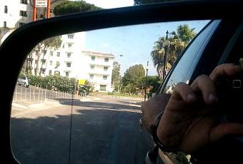Apro un occhio e guardo la mia immagine attraverso lo specchietto dell’auto.