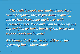 Senza mezze misure, giri di parole e soprattutto senza nascondersi dietro un dito, l'attuale Co-Publisher (ruolo che divide con Jim Lee) della DC Comics, nel corso di una intervista rilasciata al sito internet del Los Angeles Times, ha confermato che quella del DC Relaunch è una mossa disperata per destare l'attenzione dei (potenziali) lettori d'oltreoceano, scuoterli e (ri)portarli all'acquisto e alla lettura dei comic book. Il segreto di pulcinella? Forse, ma nessuno fino a ora aveva esplicitamente parlato di questa crisi (di lettori, ma a parere del sottoscritto soprattutto di idee) che attanaglia. il mondo dei comics a stelle e strisce (in fin dei conti la politica del rilancio netto e totale è solo la brusca risposta alla politica dei rilanci che da un paio di anni sta tentando la Marvel, chiudendo e facendo ripartire una dopo l'altra tutte le sue testate - insomma uno ha optato per una morte lenta, l'altra per "una di subito" - perdonatemi il termine dialettale).