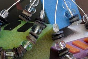 Orecchini con grande pendente a goccia con perle in vetro trasparenti bombate e tonde piatte intervallate da quadrati in madreperla grigia; gancio ad amo placcato argento