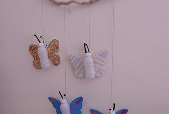 Finita la preparazione delle farfalle, sempre con la colla vinilica, abbiamo incollato le farfalle alle bottigliette, stringendo forte finchè non si fossero incollate bene. Dopo aver lasciato asciugare bene, finalmente, abbiamo potuto appendere la nostra decorazione realizzata con materiale di riciclo che comunemente si butta nella spazzatura, ma che vi assicuro, è davvero di un gran bell'effetto.