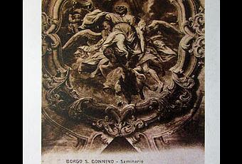 Tra le immagini, tutte di grande interesse documentario, ricavate molto probabilmente dagli scatti fotografici di Nello Coen (1890-1949), sono sicuramente da menzionare le due inquadrature della cappella di San Giuseppe situata al piano terreno. Ritroviamo così l’altare consacrato dal vescovo Adriano Sermattei nel 1714, ancora addobbato con gli arredi originari (verrà rifatto nel 1936 dal Vescovo Vianello) e soprattutto la piccola pala raffigurante la Sacra Famiglia, tradizionalmente attribuita al borghigiano Antonio Maria Formaiaroli (1679-post.1731). Da come appare nella foto stampata in bruno, la tela, andata dispersa in seguito ai devastanti bombardamenti aerei del maggio del ’44, sembra non smentire la buona fama riscossa dal pittore presso i suoi contemporanei.